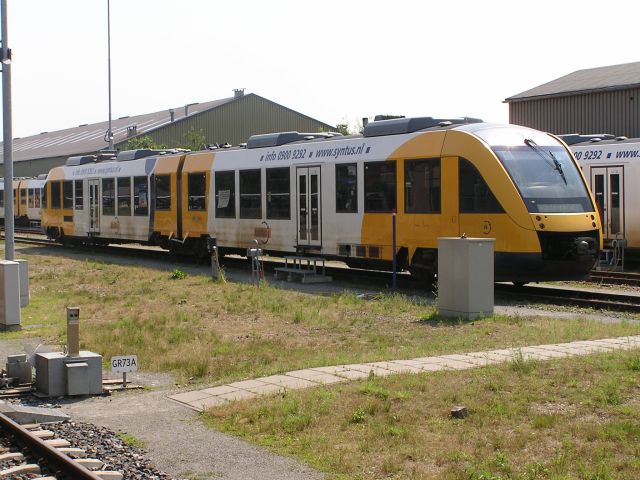 After Schaijk we rode to Oss and got the train from there to Arnhem, where we had to change trains. At Arnhem we had to change platforms via the footbridge which was not easy and then a long walk to the opposite end, to get a little 2 car DMU to Winterswijk. This is an example of one of the DMUs stabled at Winterswijk. Ceri thought the inside was like tram. As we were a bit flustered by the crowds who got on to the train - I failed to recognise where the bike stowage area was, and started to secure the tandem in an upright position. As it turned out the unit had tip up seats and was the best train for the carriage of tandems İStephen Dee 30 July 2004 ID P7307952 |