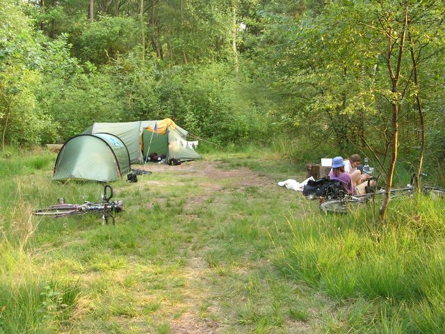From Winterswijk station we cycled to the NTKC's Het Masterveld site to the east of the town near the German border. Again this is a wooded site with nice clearings to camp in. İStephen Dee 30 July 2004 ID P7307981 |