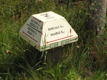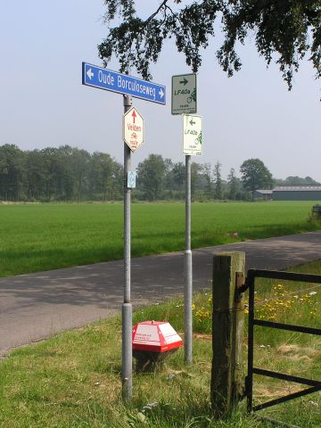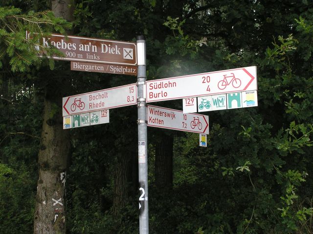 Winterswijk is very close to the border with Germany. The largest German town of note nearby is Borken, where 3M used to have a plant and I used to have dealing with colleagues there. I had hoped to ride there on the Saturday. In the end we did a shorter cross border ride to Südlohn, Weseke and Burlo. Both border crossings that day were along tracks and not a road. This a cycle sign post in Germany about a Km from the border. İStephen Dee 31 July 2004 ID P73177998