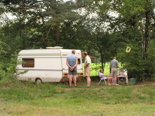 The NTKC sites are run by the members for the members. The first person on site becomes "Kampmeester", indicated by a special pennon - black K on yellow background. The Kampmeester will collect sites fees sometime during the day at a time known as "melden", these times are normally chalked up on the notice boards. At melden the kampmeester arranges a table and chairs for the campers to sit and register. Here the Kampmeester at Het Masterveld is registering a camper whilst others stand and wait. This is normally treated as an important social occasion. Note the caravan - this is as about as large they get on NTKC sites - and to take a caravan on to a NTKC site there are both size and age/length of membership restrictions. İStephen Dee 31 July 2004 ID P73178026 |