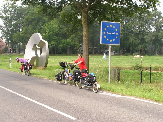Ceri and Melissa sitting astride the Dutch German border. The Netherlands are to the left. Just to the right out of shot was a shelter which seems to be common on German walking/cycling routes. İStephen Dee 31 July 2004 ID P73178000 |