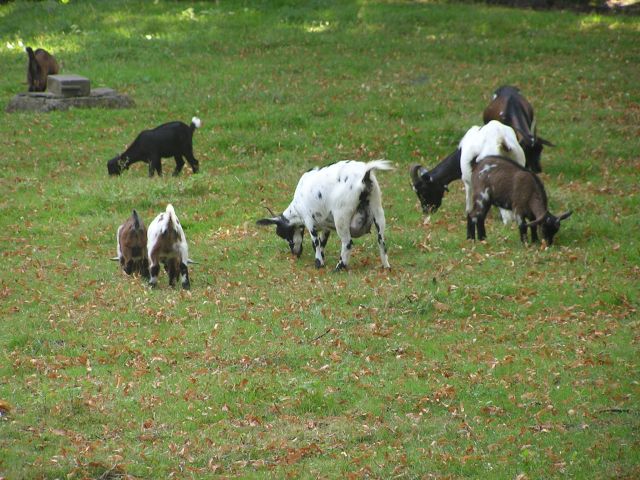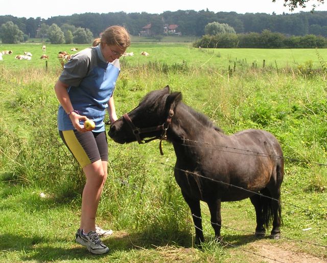 Melissa being a bit of a townie from Sarf London was not used to seeing so many different animals. The ones she loved the best were little miniature goats we saw virtually every where. Some were nice brown and white such they looked as if they the goats were white and had been dipped in chocolate! ©Stephen Dee 2 Aug 2004 ID P8028104