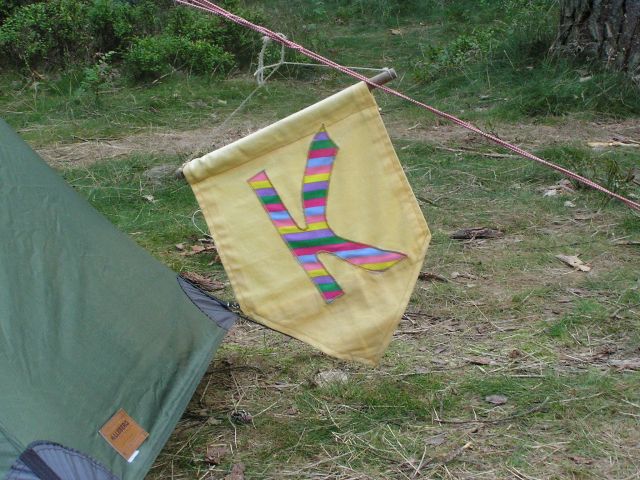 We camped in the smaller of the two large clearings at De Valkenbelt. The girls pitched a wee way away from me - they were fed up with my snoring. Along side their tent they are flying pennons we had collected from each NTKC site we had stayed at. ©Stephen Dee 1 Aug 2004 ID P8018072 |