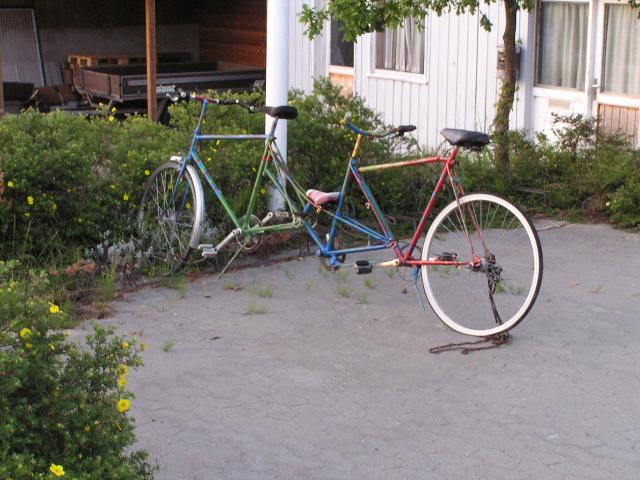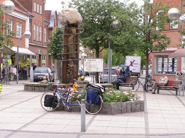 On the Monday we said "farewell and see you later" to the Rowe's whilst we made our separate ways. They took a leisurely ride across Jylland - we were more ambitious going island hoping to the Tandem Rally. We had a fast ride to lunch at Grindsted. Here stopped for some time to buy our copy of "Over natning" from the local bookshop. We had to find somewhere to camp later in the day! It was in Grindsted that we met up with Davies family who were also making their way to Tommerup St. One of their tandems is seen in this view. Ceri-Siân would later ride that tandem a few miles at the Tandem rally. ©Stephen Dee 18 July 2005 ID P7184676 |