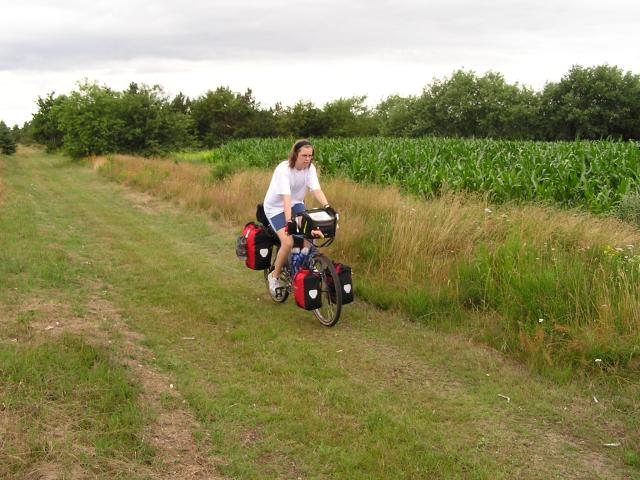 We used the 1:200000 maps which did not show cycle paths or routes, but did show most roads outside of towns and villages, including roads which were dirt tracks. Heading out of Grindsted we were trying to find the road out to Fiskov and by serendipity we came across this old railway route, which took us all the way from Grindsted to Fiskov. As we entered Fiskov we were met by locals who invited us in for coffee and asked what we thought of the track. We declined the coffee as it was gone 4pm and we still had a few miles to do. However we did chat long enough to offer our view on the track. They were taken back when we explained we enjoyed the track as it was, as we were members of the RSF. Apparently there has been debate in the local council about which cycle paths to upgrade next! ©Stephen Dee 18 July 2005 ID P7184683 |