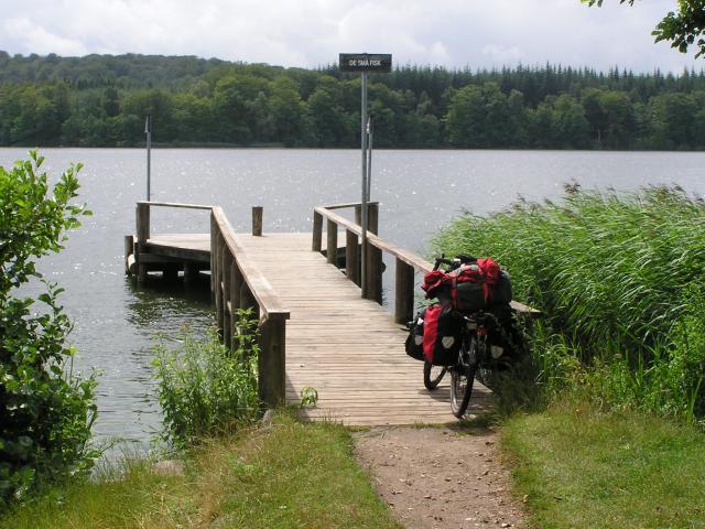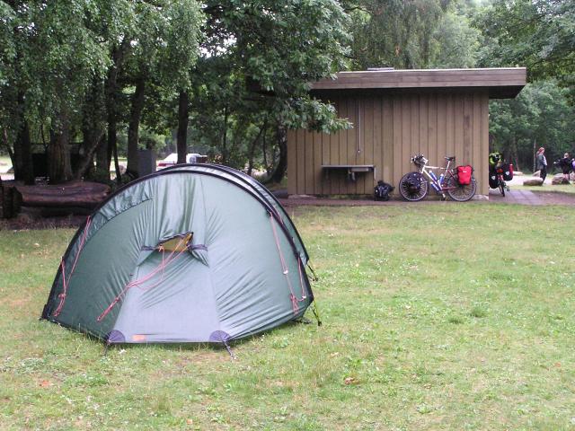 After Them, we headed through Silkeborg and into the Danish Lake District. As we left Silkeborg at lunch time we were hit by a tremendous thunderstorm accompanied by very heavy rain. We had planned to picnic by one of the lakes. With the rain we wanted shelter and in the end we found, what turned out to be Over natning site 302, Teltpads ved Brassø for kanofarer, "De Små Fisk". We put theory to test and pitched our tent fly sheet, for our Hilleberg Stallon 2GT, only to enable us to have a dry lunch. By the time we finished lunch the clouds blew away and we had a glorious afternoon and evening. ©Stephen Dee 19 July 2005 ID P7194735