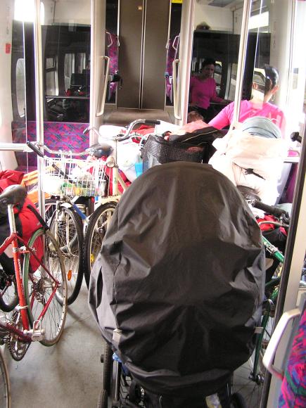 All trains in Danmark seemed to be cycle friendly, some more then others. What struck us was the laid back attitude of the railway staff and fellow passengers. The train we got from Nykøbing S, had a nice cycle/pram compartment. However it was somewhat crowded for a lot of the journey. At the point the photo was taken there were 10 cycles, a baby trailer blocking the door on the left and a pram. Passengers climbed over the cycles to board or get of the train. One cyclist had to carry his bike from the far side of the pile to the other doorway behind me to get off as the door on the left was blocked. We had got on the train first, so our cycles were placed either side and are at the bottom of the pile. It was a good job we were getting the train all the way to the end of its journey. ©Stephen Dee 20 July 2005 ID P7204784 |